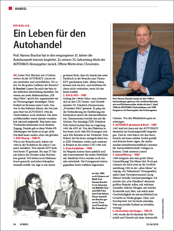 Prof. Hannes Brachat hat in den vergangenen 35 Jahren die Autohauswelt intensiv begleitet. Zu seinem 70. Geburtstag blickt der AUTOHAUS-Herausgeber zurück. Offene Worte eines Chronisten.Download Artikel