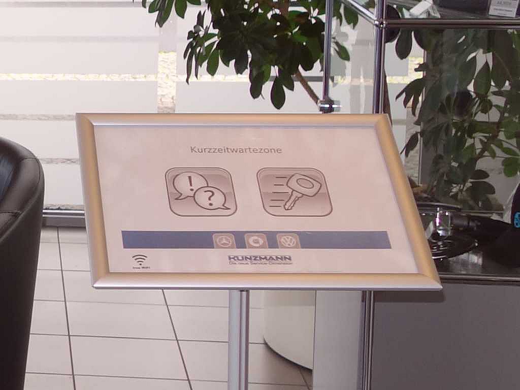 Die Diktion, keine Wartezeiten für die Reifenkunden. Außerdem werden werblich spezifische Reifenofferten abgebildet. – siehe Abb. Sollten zwei Kunden gleichzeitig aufschlagen, nimmt der Kunde in Kurzwarte-Lounge Platz. Die Serviceassistentin führt den Kunden dem nächsten Serviceberater zu. Der Serviceberater checkt außerdem diverse Winternotwendigkeiten durch, die Flüssigkeitsstände, das Licht, Bremsanlage, Schweibenwischeranlage, die Winschutzscheibe auf Steinschlag und Risse, Wischer-/Gummi-/Blatt auf Risse und Verschleiß, die Batterie u.a. Es wird außerdem Kühlmittelfrostschutz ergänzt, Schweibenwaschmittel aufgefüllt sowie eine Sichtprüfung der Unterseite vorgenommen. Klar, gegen Bezahlung.