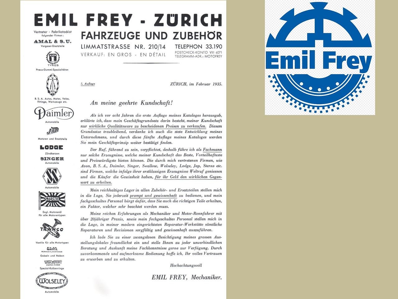 Im Februar 1935 schrieb Emil Frey, Mechaniker, an seine geehrte Kundschaft einen Brief.