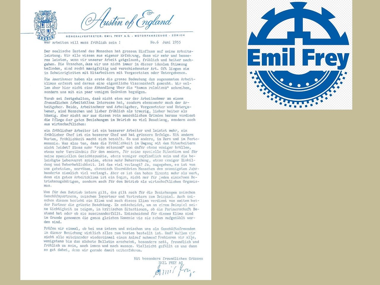 Emil Frey weiter: Ich bin nicht der Auffassung, dass der Mensch nicht in erster Linie arbeiten soll, um möglichst mühelos möglichst viel Geld zu verdienen. Arbeit und Leistungen sollen Freude machen, dann stellt sich der materielle Erfolg, ganz beiläufig, aber dauerhaft ein. Fröhliche Mitarbeiter sind gute Mitarbeiter. Das ist 1955 die Botschaft von Emil Frey an seine Mitarbeiter.