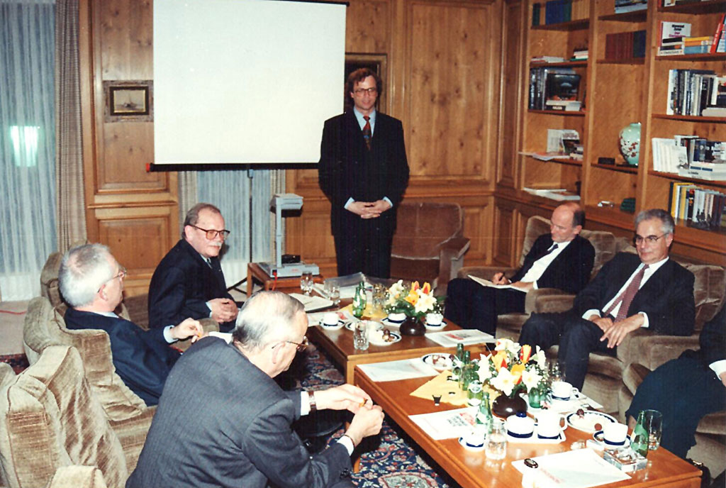 Im Gästehaus “Rothehof” der Volkswagen AG kam am 7. April 1992 der Konsumentenbeirat von Volkswagen zusammen.AH-Chefredakteur Hannes Brachat referierte dabeim zum Thema „Automobilhandel der Zukunft aus verkäuferischer Sicht“. Teilnehmer des Forums waren u.a. der Vorstandsvorsitzende der VW AG, Dr. Carl H. Hahn (v.li.), dessen designierter Nachfolger Dr. Ferdinand Piech (zw.v.re), Konzernvertriebsvorstand Dr. W.P.Schmidt sowie MMI-Geschäftsführer Odert von Rutenberg.