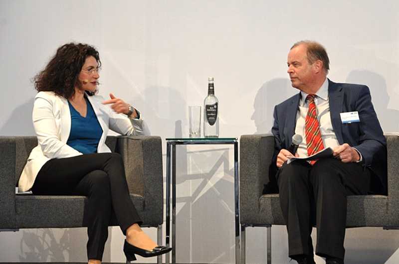 Tina Müller, Vorstand-Marketing der Adam Opel beim Puls-Kongress am 12. März 2015 im Oldtimermuseum, Dauphin Speed-Event-Halle zu Hersbruck im Interview mit Prof. Hannes Brachat.