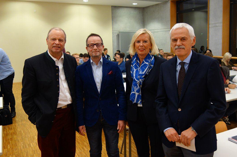 Marion Johl, die Generalbevollmächtigte der Santander Consumerbank AG wird am 2.12.2015 offiziell an der Hochschule für Automobilwirtschaft Geislingen verabschiedet. Ihr Vortrag als Gastdozentin befasste sich mit dem Wesen und Wandel unternehmerischer Tugenden. Prof. Dr. Willi Diez (re) hielt auf die große Förderin der Hochschule die Laudatio. Mit im Bild, der Dekan der Hochschule, Prof. Dr. Stefan Reindl und der Veranstalter der Vortragsreihe an der Hochschule: Prof. Hannes Brachat.